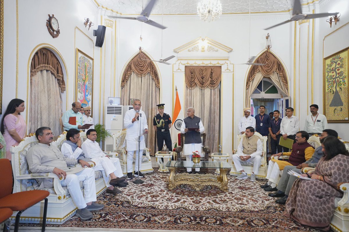इसमें कांग्रेस छोड़ बीजेपी में शामिल हुए विजयपुर विधायक रामनिवास रावत को राजभवन में कैबिनेट मंत्री पद की शपथ दिलाई