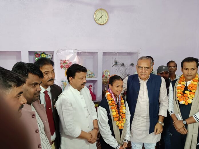 थाईलैण्ड में आयोजित वर्ल्ड एविलिटी स्पोर्टस में भारतीय पैरा टीम में शामिल श्योपुर जिले की पैरा खिलाड़ी कु. कनक भदौरिया के 100 मीटर एवं 200 मीटर दौड में गोल्ड मेडल जीत वापस श्योपुर लौटने पर शहरवासियों द्वारा भव्य स्वागत किया गया। इस अवसर पर पूर्व वन मंत्री रामनिवास रावत एवं कैबिनेट दर्जा मंत्री तथा मध्यप्रदेश हज कमेटी के अध्यक्ष रफत वारसी ने उनके घर पहुंचकर शुभकामनाएं दी।