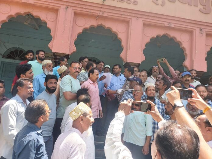 नगर पालिका भवन, विरोध करते दुकानदार, ज्ञापन सौंपते हुए लोग