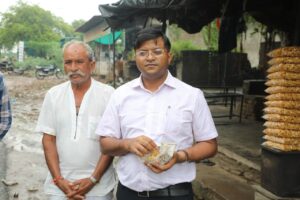 उन्होंने एक किलो नमकीन का पैकेट खरीदा और दुकानदार श्री श्यामसुंदर नामा से चर्चा की।