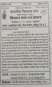 भारतीय किसान संघ ने जिले के सभी किसान भाइयों से 7 नवंबर को श्योपुर पहुंचकर अपने अधिकारों की लड़ाई में शामिल होने की अपील की है।