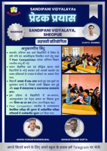 शिक्षा के क्षेत्र में नवाचार एवं गुणवत्तापूर्ण शिक्षण को प्रोत्साहित करने हेतु संचालित प्रेरक प्रयास योजना के अंतर्गत सांदीपनि विद्यालय, श्योपुर के शिक्षक विजय शर्मा का चयन किया गया है। उनका यह चयन शिवपुरी में आयोजित विद्यालय प्रेरक प्रयास प्रतियोगिता में प्रस्तुत नवाचारी शिक्षण पद्धति के आधार पर किया गया।