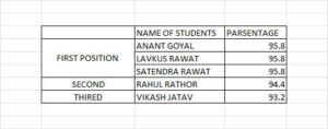 कला में श्रीति बंसल, विज्ञान में कुशाग्र मित्तल, वाणिज्य में तनीशा जाट और कृषि में कृष्णा राठोर टॉप पर रहे।